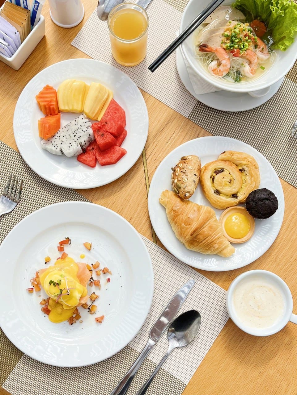 Indulge in a diverse selection of dishes, featuring a daily live cooking station that showcases fresh, made-to-order specialties alongside an enticing à la carte menu. Whether you’re in the mood for a classic Omelette, fragrant rice porridge, or delicious pastries, there’s something to satisfy every palate.